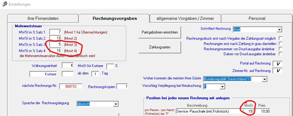 Bitte ändern Sie nicht die vorgegebenen Einstellungen in den Containern für Satz 1 und Satz 2 (7% und 19%), setzen Sie zusätzlich 5% bei MwSt.3 und 16% bei MwSt. 4 ein, sonst würden sich bei der Auswertung später die Steuersätze vermischen! Bitte in den Containen für MwSt. (Mehrwertsteuer) nach der Eingabe auch nichts mehr ändern. Die MwSt. für Übernachtungen im Buchungszeitraum ab 01.07.2020 - 31.12.2020 wird bei Neubuchungen ab der Version 5.00.25 automatisch von MwSt.-Satz 1 auf MwSt.-Satz 3 umgeleitet. Beim Frühstück gibt es noch keine klare Regelung, daher passen Sie bitte die MwSt.-Sätze direkt auf der Rechnung oder ab 01.07.2020 bei "Position bei jeder Rechnung neu anlegen" als Vorgabe entsprechend an.