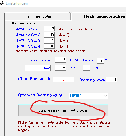 Die Vorgaben für den Text des Zahlungsziels werden in Einstellungen – Stammdaten – Rechnungsvorgaben – „Sprachen einrichten / Textvorgaben“ hinterlegt: